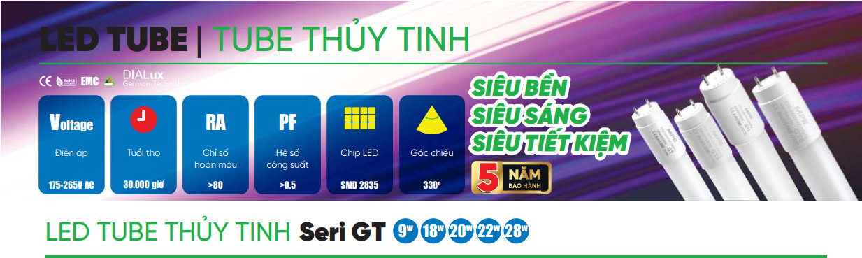 Bóng đèn tube thủy tinh GT5 1m2 công suất 22w
